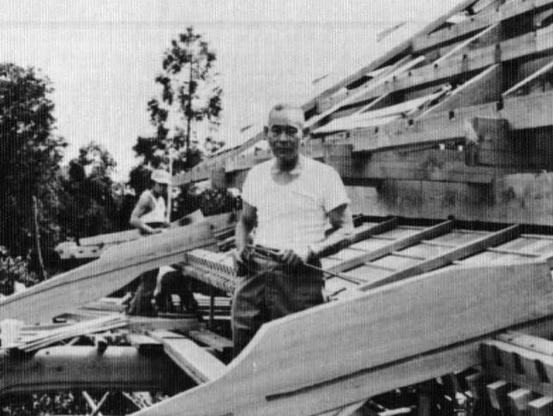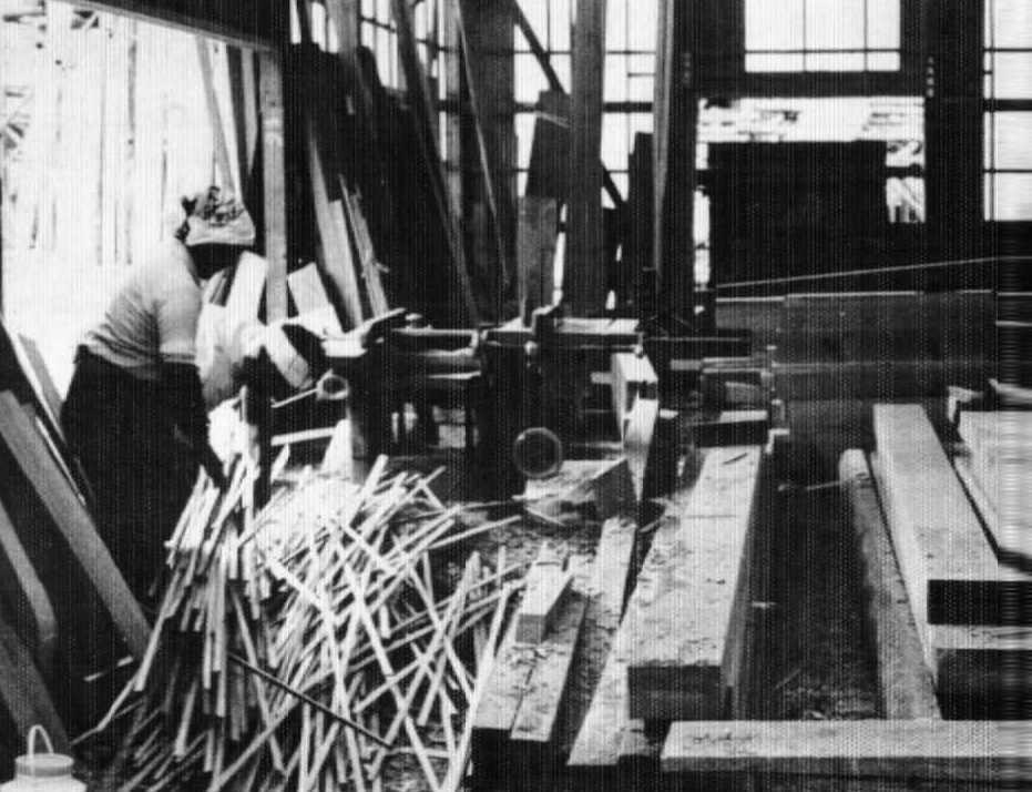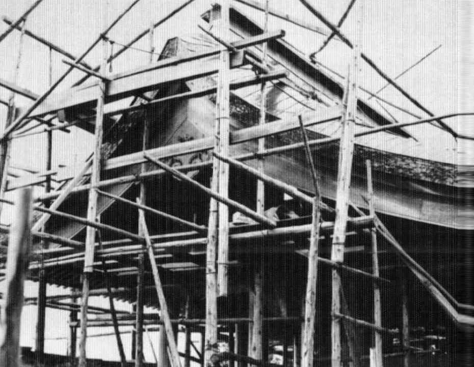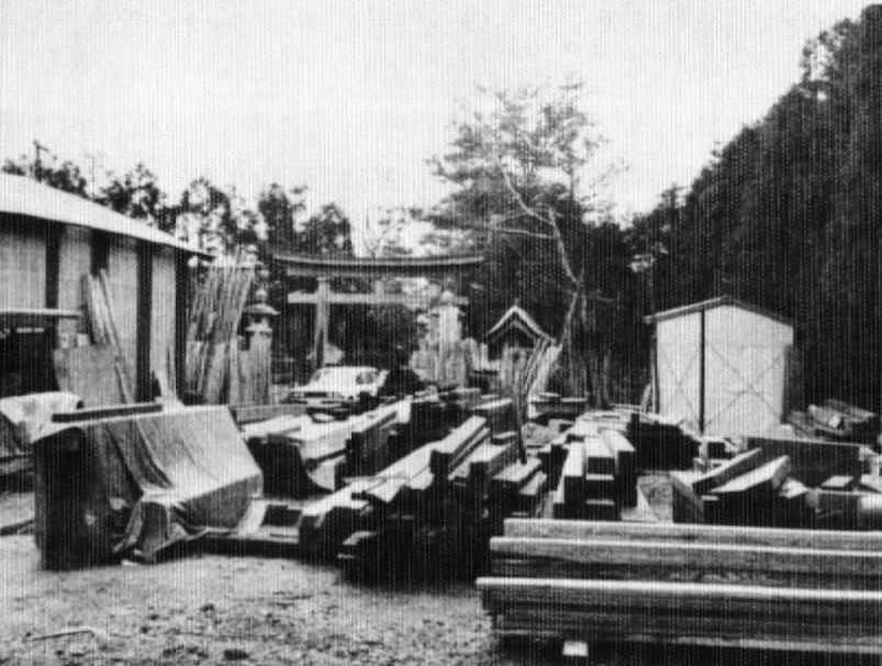 上早神社の改築時の写真を見てみようかの。神社は「木組み」といって釘や金物(ちょうつがい、掛け金など)を使わず、木材自体に切り込みを入れて、パズルのようにはめ合わせて建てられているんじゃよ。